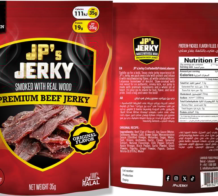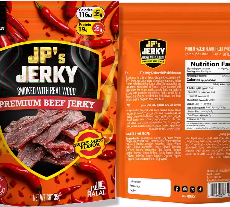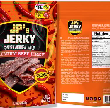 Saddle up for a bold, Texas-style jerky experience! At JP's Jerky, we pack every bite with protein and infuse it with mouthwatering flavor, all while celebrating our Lebanese hometown of Amchit. Slow-smoked with real wood for an authentic, smoky kick, our jerky is made with premium ingredients and a whole lot of heart. It’s your go-to snack for fuel, flavor, and local pride. Grab a bag and savor the bold!